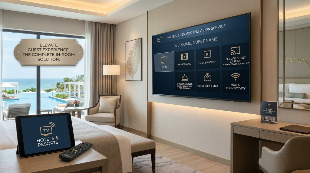 The next generation of in-room entertainment. Evolve is an Android TV-certified platform that gives guests instant access to Netflix, Hulu, YouTube, Disney+, and every major streaming app — right on the room TV.